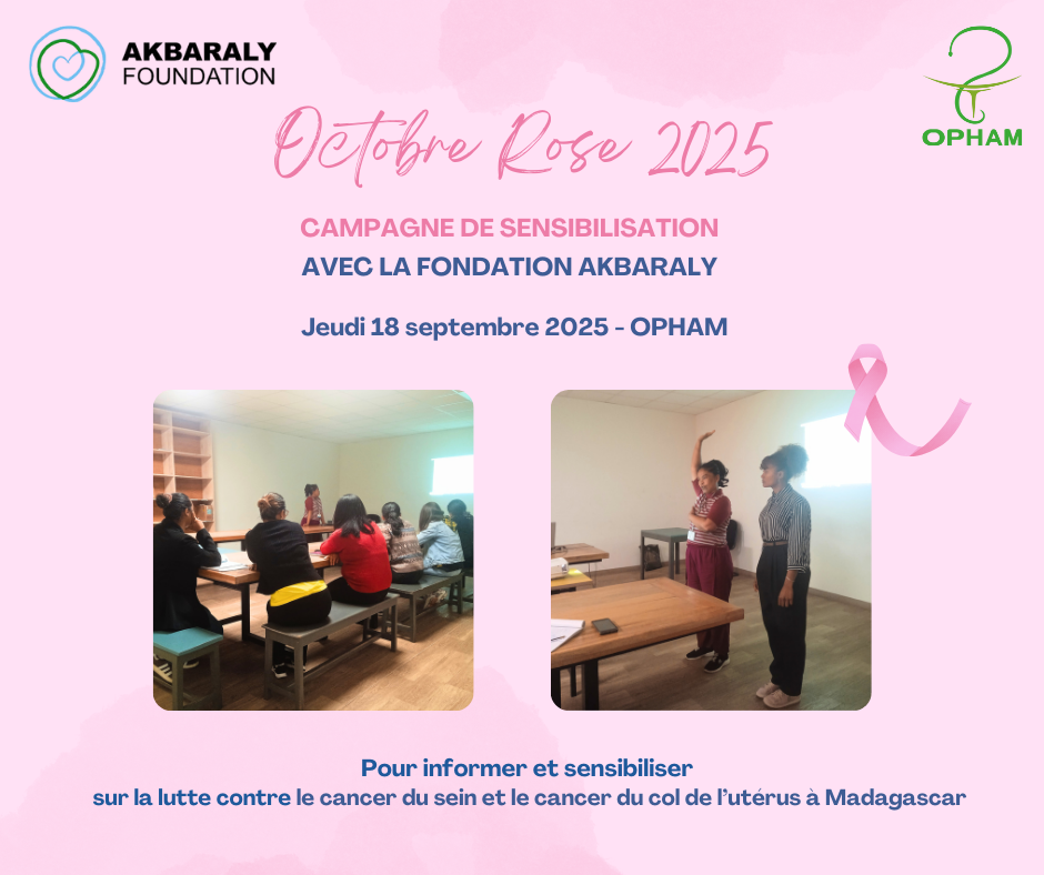 Dans le cadre d'OCTOBRE ROSE 2025, OPHAM - Office Pharmaceutique Malgache a accueilli, le 18 septembre dernier, Dr RAHERIMANANA Jenny, médecin chez la Fondation Akbaraly, pour informer et sensibiliser nos collaboratrices sur les actions préventives et les risques concernant le cancer du sein et le cancer du col de l'utérus.