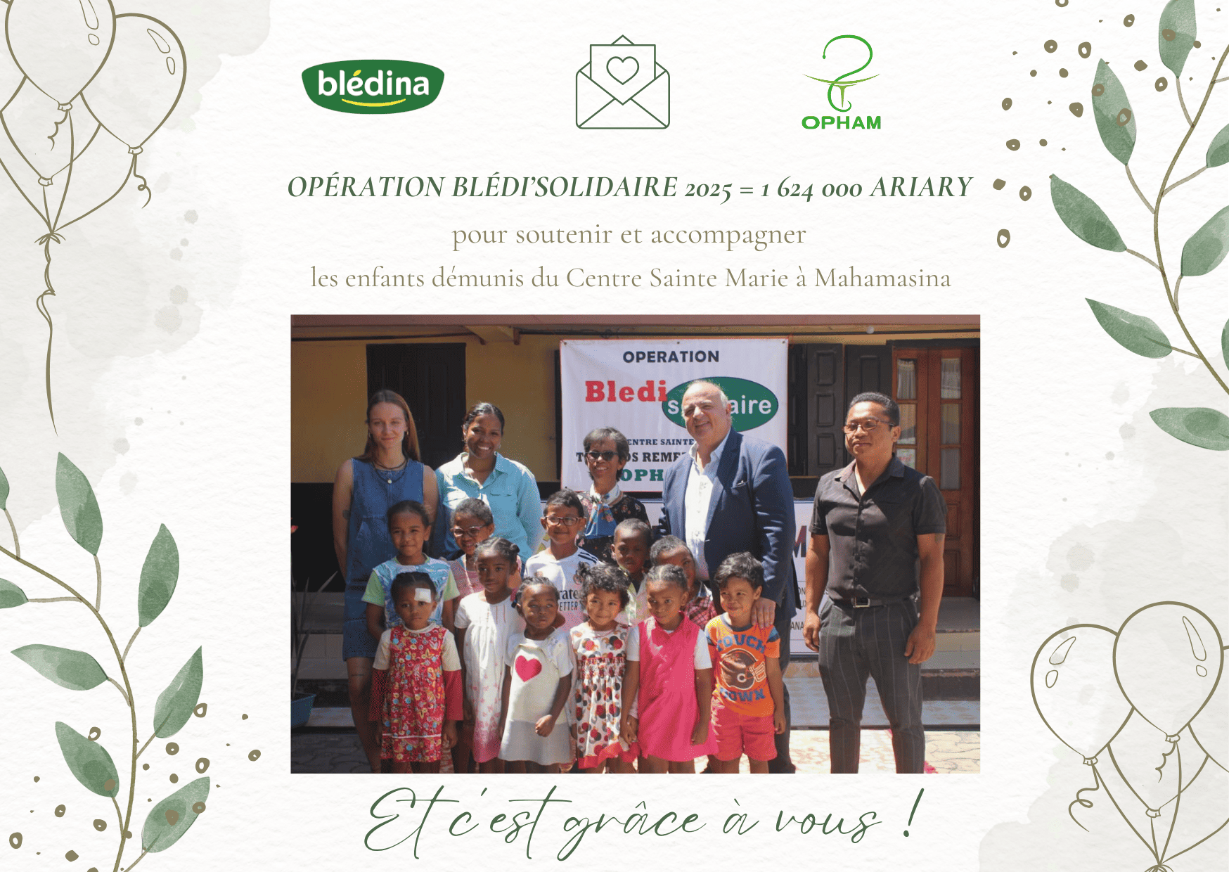 L’opération Blédi’Solidaire consiste pour OPHAM et S2M, à verser 2 000 ariary au Centre Sainte Marie pour chaque boite vendue. La somme totale récoltée 1 624 000 ariary a été reversée à l’ONG afin de soutenir leurs actions en faveur des enfants et familles démunies, dont leur réinsertion sociale et l’amélioration de leurs conditions de vie.