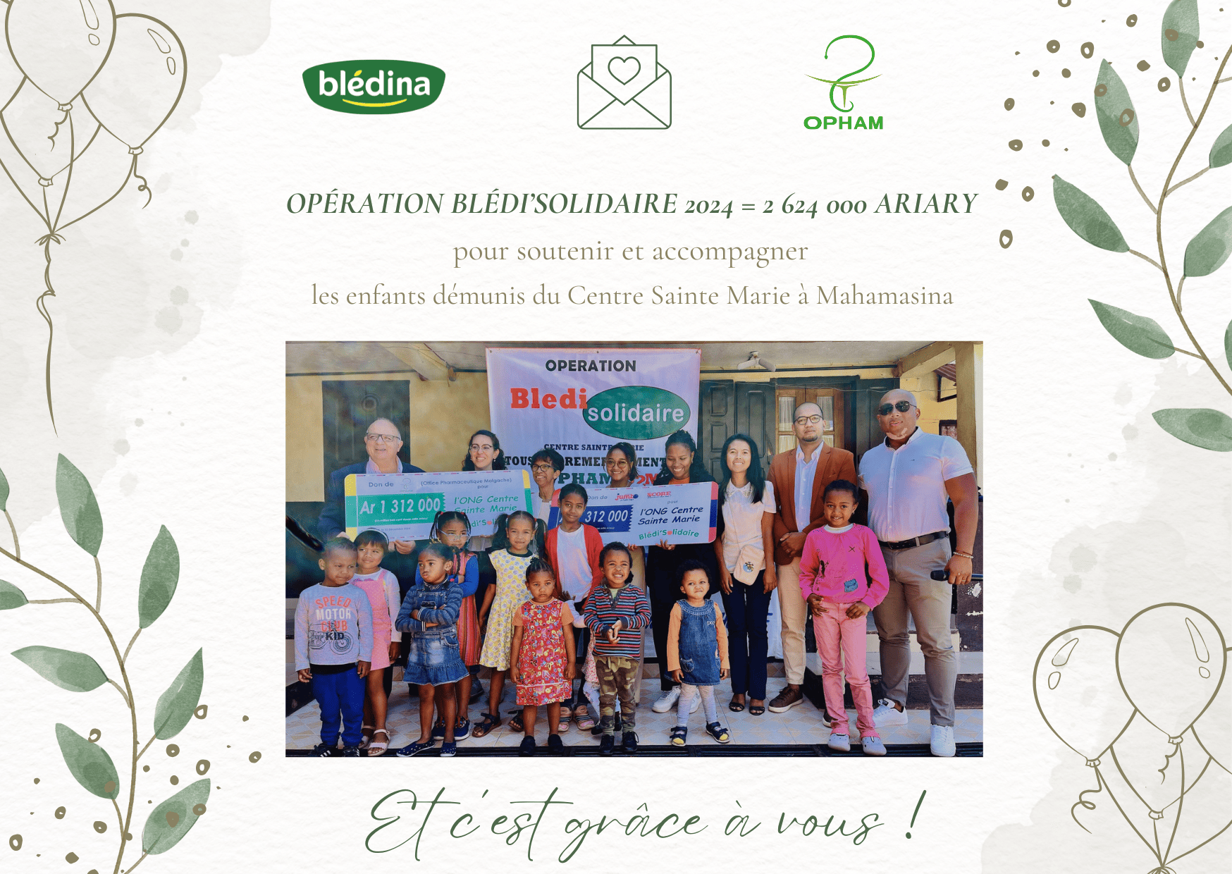 L’opération Blédi’Solidaire consiste pour OPHAM et S2M, à verser 2 000 ariary au Centre Sainte Marie pour chaque boite vendue. La somme totale récoltée 2 624 000 ariary a été reversée à l’ONG afin de soutenir leurs actions en faveur des enfants et familles démunies, dont leur réinsertion sociale et l’amélioration de leurs conditions de vie.