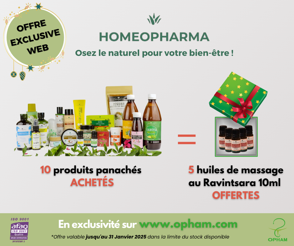 Profitez d’un pur moment de détente avec 5 flacons d’huiles de massage au Ravintsara 10ml OFFERTS en achetant 10 produits panachés HOMEOPHARMA sur www.opham.com