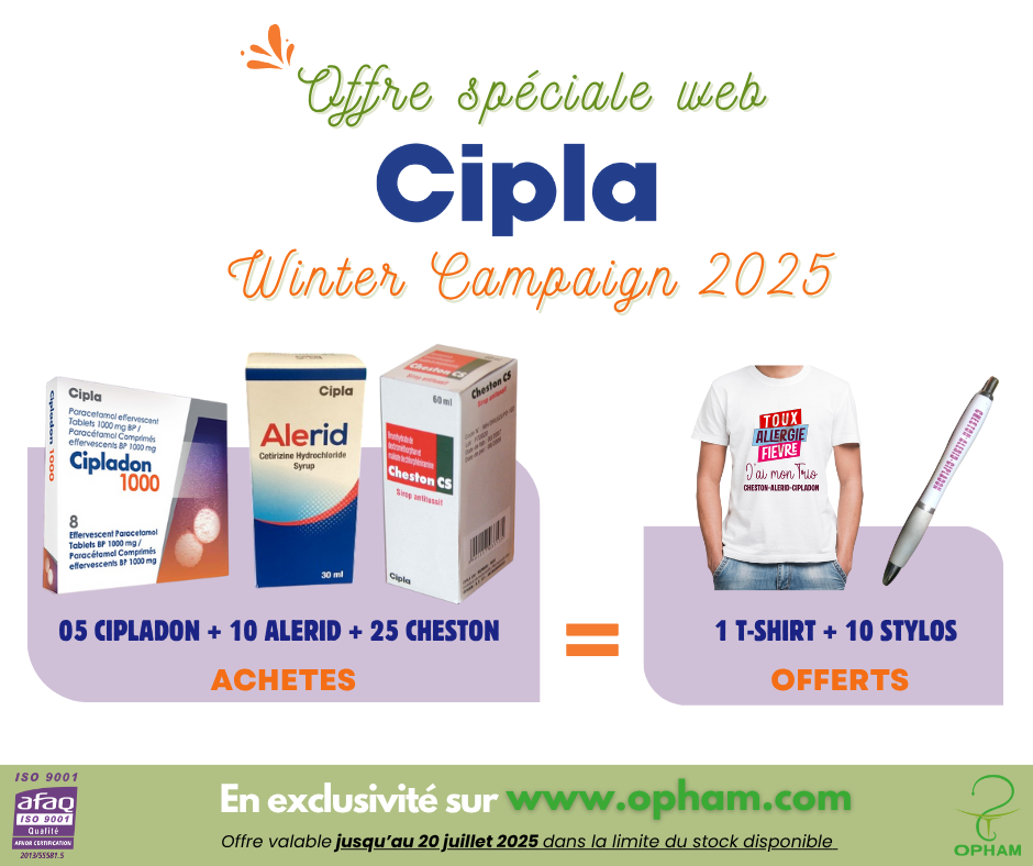 Profitez de nos offres exclusives sur les produits CIPLA avec 25 CHESTON + 10 ALERID + 05 CIPLADON achetés = 01 T-SHIRT ET 10 STYLOS offerts