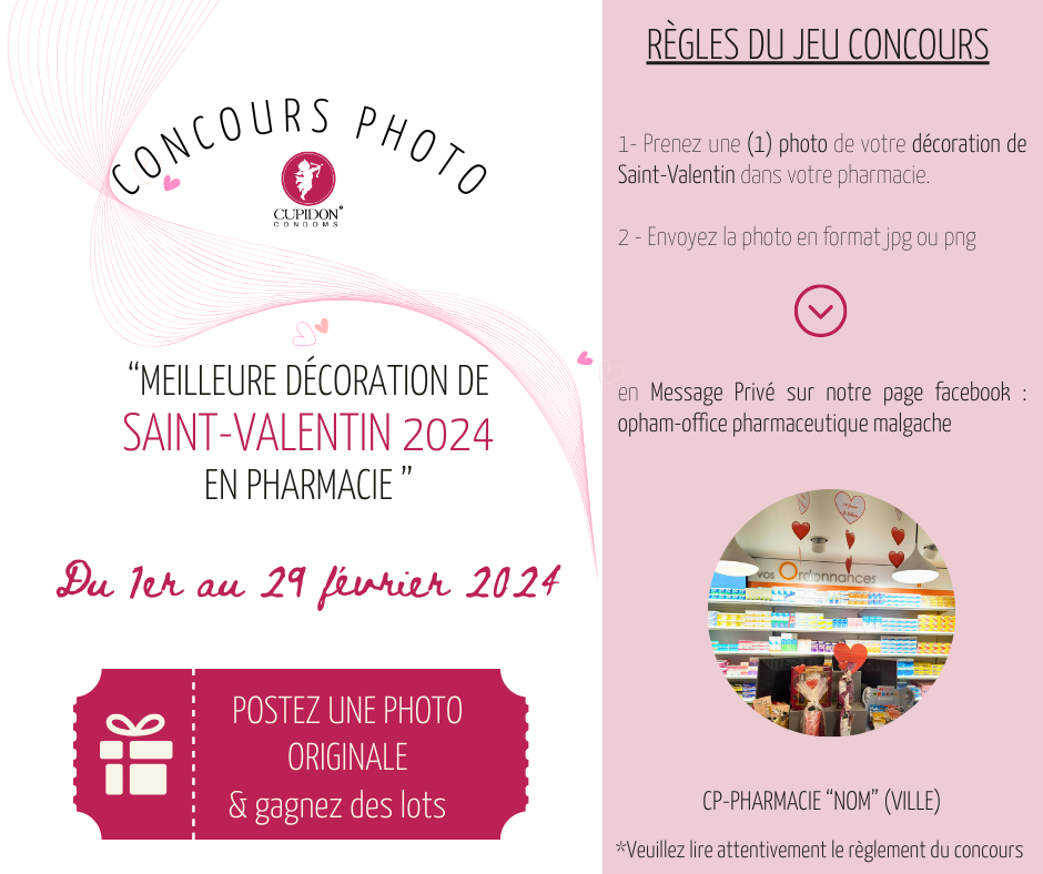 A l’occasion de la Saint-Valentin, OPHAM en collaboration avec CUPIDON, organise un jeu concours photo de « LA MEILLEURE DÉCORATION DE SAINT-VALENTIN 2024 EN PHARMACIE » du jeudi 1er au jeudi 29 février 2024.