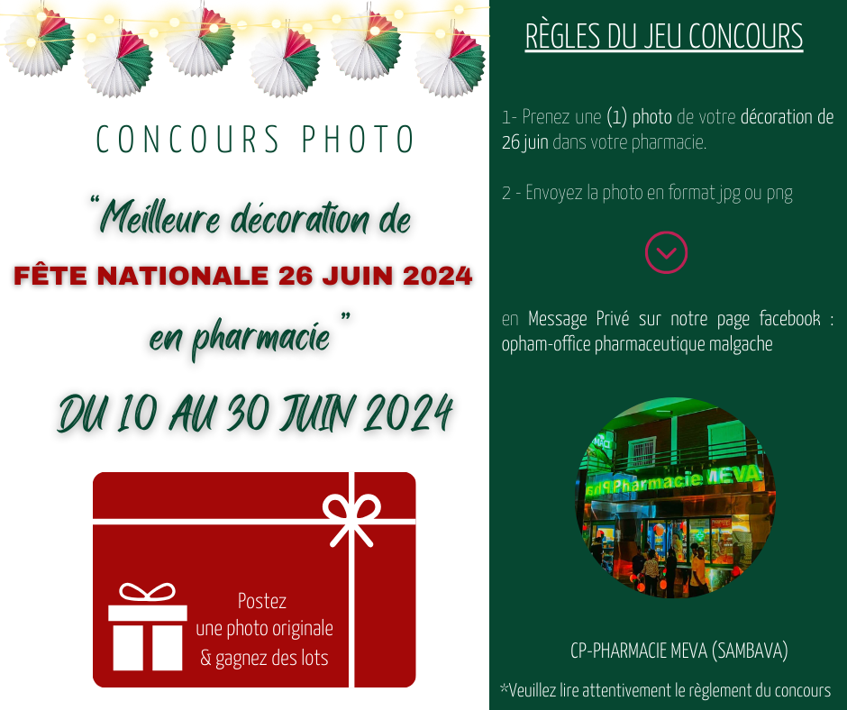 CONCOURS PHOTO DE LA MEILLEURE DECORATION DE FETE NATIONALE 26 JUIN 2024 EN PHARMACIE