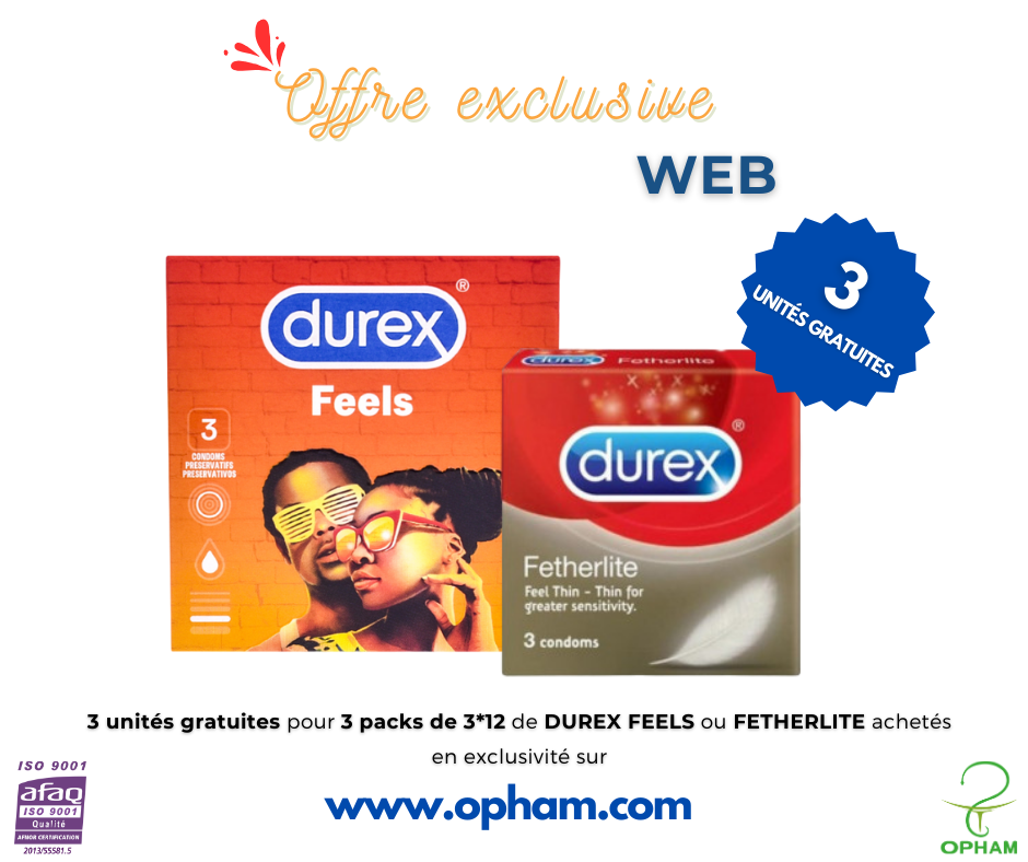 Commandez dès maintenant sur www.opham.com 3 packs de 3*12 de DUREX FEELS ou DUREX FETHERLITE et recevez 3 unités gratuites !